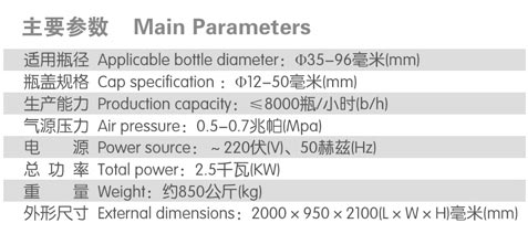 適用不同規(guī)格圓瓶、方瓶的外蓋自動(dòng)旋合,具有結(jié)構(gòu)緊湊、操作簡單,調(diào)整規(guī)格方便快捷的特點(diǎn)。